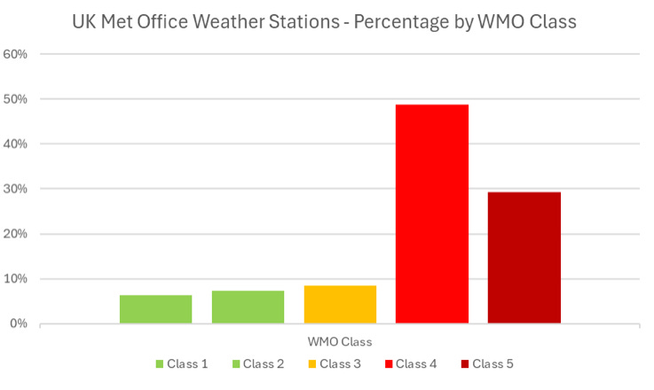 Pervasive Poor Siting. Nearly 8 out of 10 (77.9%) of the Met Office’s 380 UK temperature stations are classified by international standards from the World Meteorological Organisation (WMO) as 'junk' or 'near junk' (Class 4 and 5). This means their readings could be off by up to 5°C. These stations are often located near artificial heat sources like buildings, concrete, airports, and car parks.